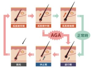髪の毛が太く長く成長する前に抜けてしまうのが、AGAによる薄毛の仕組みです。 そのため、AGAを発症すると細く短い髪の毛が増えるようになります。 【毛周期の図】