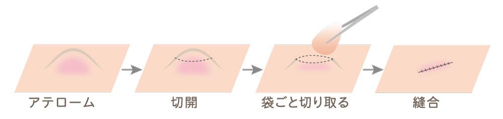 摘出手術を行っても、残念ながら粉瘤は再発の可能性があります。 再発を繰り返してしまう場合には、切開を加えて粉瘤を含めて大きく切り取る切開法が必要になることもあります。