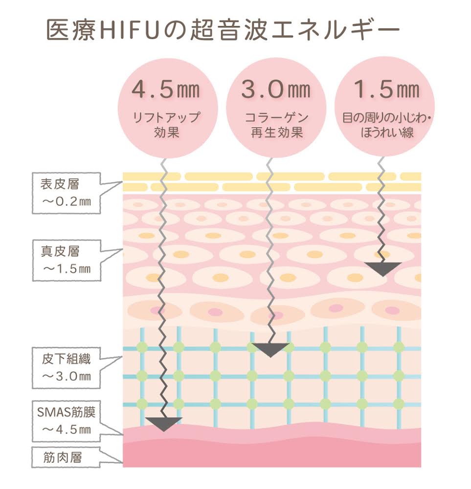 医療HIFU(ハイフ)とは、今までフェイスリフトなどの外科手術でしか治療できなかった、肌の土台となるSMAS筋層に超音波を照射することで、リフトアップができるたるみ引き締め治療です。