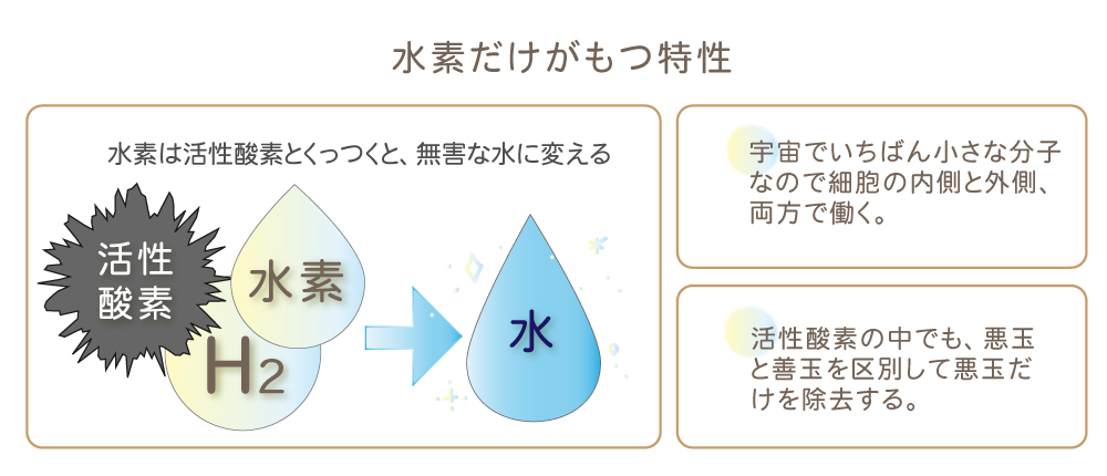 また、水素は動脈硬化やがん、糖尿病などの病気をはじめ、シミやシワなどの老化現象の原因となる「悪玉活性酸素ヒドロキシラジカル」を体内から除去する働きがあります。