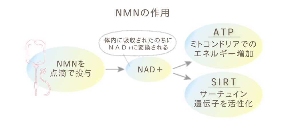 NMN点滴を利用することで、サーチュイン遺伝子が活性化され、いつまでも若さを保ちながら、健康的な生活を送ることができます。