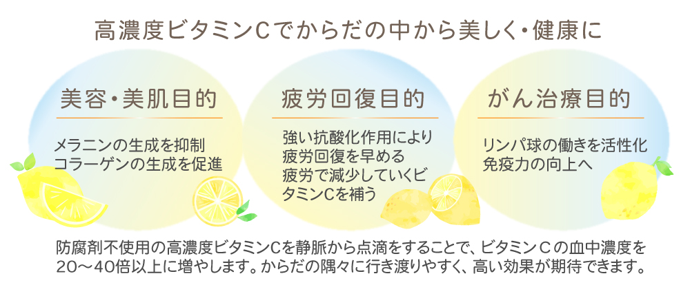 なお、ビタミンC点滴治療を受けている期間は、併せてビタミンCサプリメントを摂取するのがおすすめです。